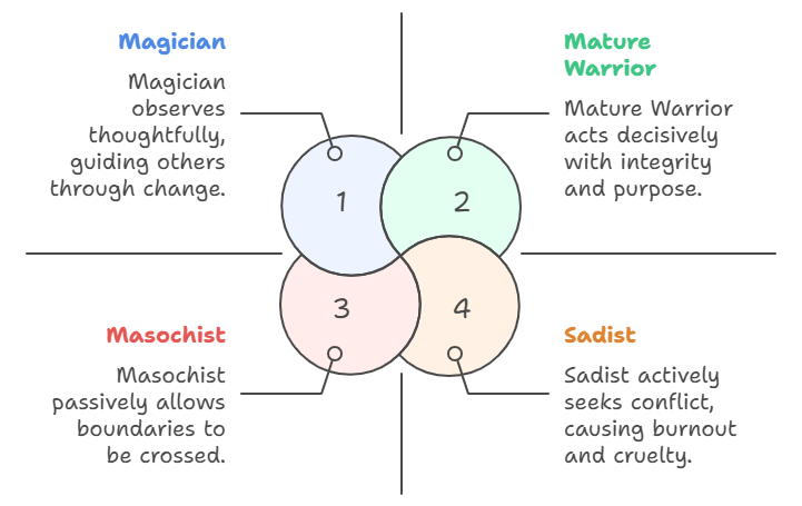 - Bipolar Shadow: The Warrior’s shadow is the Sadist and the Masochist. The Sadist enjoys conflict for its own sake, creating burnout and using cruelty to assert dominance, pursuing victory at any human cost. He is the passionless “killing machine.” The Masochist is the opposite; passive, unable to act, and allowing his boundaries to be crossed. He feels like a victim, unable to endure the necessary pain to achieve his goals. When facing a tough negotiation, does your inner Warrior remain clear and principled, or does it degrade into the destructive anger of the Sadist?
