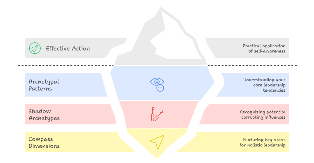 A conscious leader intentionally nurtures each of the Compass’s six dimensions, drawing on a balanced expression of the four core archetypes. Crucially, they must also remain vigilant for how the shadow archetypes can corrupt each dimension.